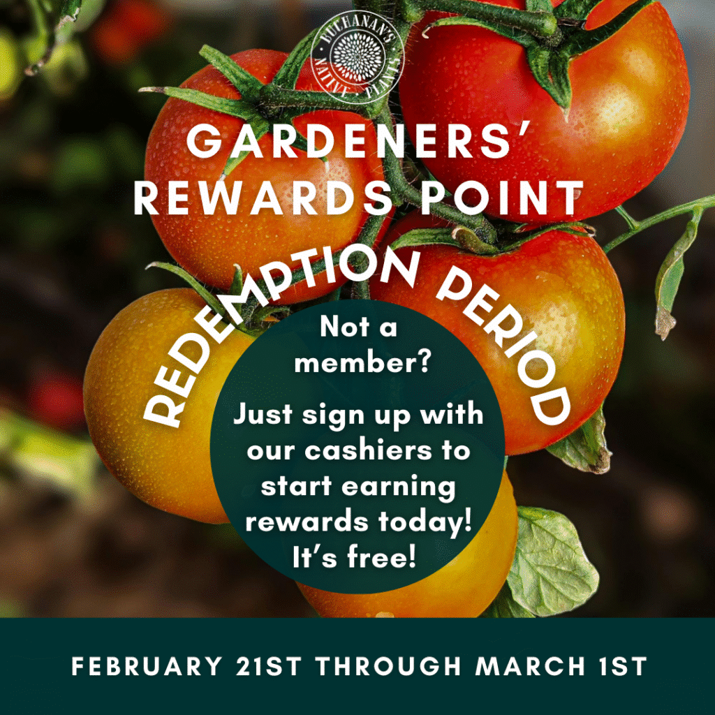 Earn $1 point for every $30 purchase. Redeem points for up to 50% of your purchase during special redemption periods. Receive our weekly email newsletter with gardening tips and info on specials and events. Nothing to carry or remember — we can quickly look you up! And points don’t expire.
