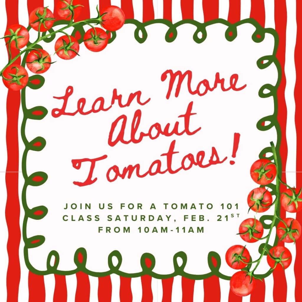 Growing spring tomatoes, but not sure where to start? Stop in Saturday morning to learn how to have a successful spring tomato growing season and bountiful harvest! In this class, Stash will teach you how to get started, share our favorite products, and more.